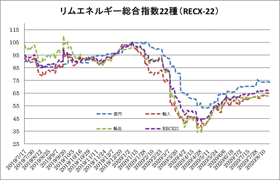 19日のリムエネルギー総合指数22種(レックス22)は、前日から0.05ポイント安の67.53と反落した。国内(9種)は73.73(同0.06下落)、輸入(9種)は66.30(同0.16上昇)、輸出(4種)は62.54(同0.29下落)。 国内指数はA重油とLSA重油4種がいずれも同0.19ポイント続落した。先物価格の下落を反映した。西日本の灯油も同0.74ポイントの弱含み。需給の緩みが相場を押し下げた。 輸入指数はまちまち。FO380cstが同1.90ポイント、LSFOが同1.75ポイント、それぞれ続伸。先物価格の上昇に引っ張られた。一方、ジェット燃料は同0.93ポイントの反落。軟調なシンガポール市況を受けた。 輸出指数はFO380cstを除いて下落。ベンゼンは同0.85ポイント下落した。需要の弱さを反映した。FO380cstは輸入指数同様、先物価格の強さを背景に、同1.96ポイント続伸した。