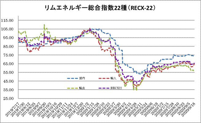 18日のリムエネルギー総合指数22種(レックス22)は、前日から0.05ポイン高の65.44と小幅に続伸した。国内(9種)は73.32(同0.15下落)、輸入(9種)は64.47(同0.34上昇)、輸出(4種)は58.53(同0.04下落)。 国内指数は総じて下落。軽油は京浜と阪神渡しで同1.81ポイントそれぞれ下落した。前日の海陸市場下落を引き摺り、相場は大幅に軟化した。灯油は京浜渡しで同0.28ポイント上昇したが、阪神渡しでは同0.92ポイント反落した。京浜渡しでは先物価格の上昇を反映し、相場は引き上げられた。一方、阪神渡しは売り圧力の台頭が相場を下押しした格好。 輸入指数は総じて上昇。ナフサは同1.86ポイント高。LPGのプロパンは同0.64ポイント、ブタンは同0.61ポイントそれぞれ強含んだ。いずれも堅調な原油相場を反映した。 輸出指数は総じて下落。軽油は同0.50ポイント切り下がった。先物価格の下落を映した。また、ベンゼンは同0.29ポイント下落した。買い気の後退を受けた。
