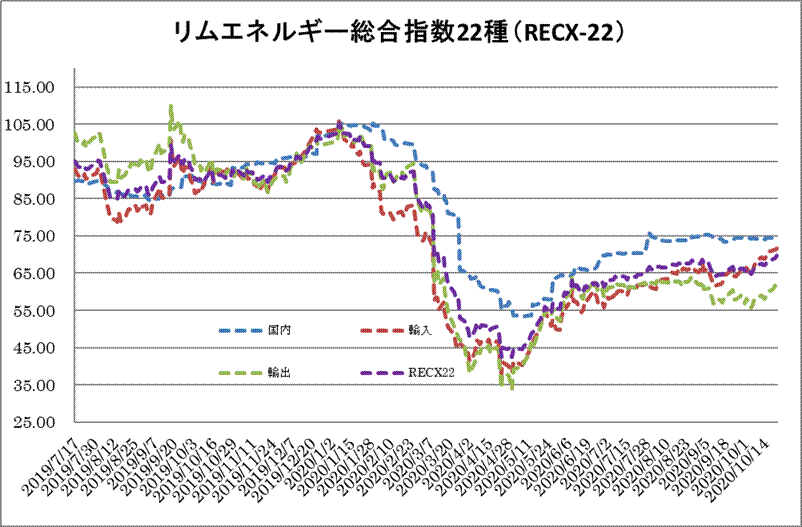 22日のリムエネルギー総合指数22種(レックス22)は、前日から0.56ポイント高の69.72と6日続伸した。国内(9種)は74.97(前日比0.47上昇)、輸入(9種)は71.76(同0.58上昇)、輸出(4種)は62.43(同0.64上昇)。