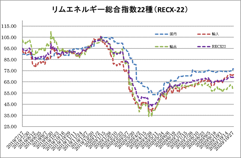 29日のリムエネルギー総合指数22種(レックス22)は、前日から0.11ポイント安の69.18と反落した。国内(9種)は76.56(前日比0.27下落)、輸入(9種)は71.39(同0.01上昇)、輸出(4種)は59.59(同0.07下落)。