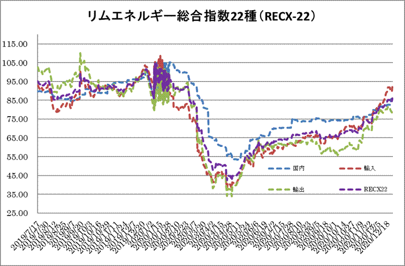 27日のリムエネルギー総合指数22種(レックス22)は、前日から0.56ポイント高の90.72と続伸した。国内(9種)は95.93(前日比0.39上昇)、輸入(9種)は91.83(同1.20上昇)、輸出(4種)は84.39(同0.07上昇)。 国内指数は、総じて上昇。LSC重油は京浜と阪神渡しで同4.32ポイントそれぞれ大幅に上昇した。需給の引き締まりが影響した。一方、ガソリンは京浜と阪神渡しで同0.73ポイントそれぞれ下落した。先安観により相場は下押しされた格好。 輸出入指数は、総じて上昇。輸入のブタンは同7.84ポイント大幅に上昇した。一方、プロパンは同0.06ポイント反落した。ブタンは需要回復を背景に急伸した。対して、プロパンは買い気の後退を受け弱含んだ。輸入の液化天然ガス(LNG)は同0.69ポイント高。需給の引き締まりが要因。また、輸出入のベンゼンは同0.07ポイント超の上げ幅となった。誘導品であるスチレンモノマー(SM)相場高を受けた。