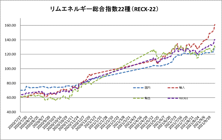30日のリムエネルギー総合指数22種(レックス22)は前日から0.09ポイント下落し140.28と反落した。国内(9種)は129.68 (前日比0.23上昇)、輸入(9種) は161.11 (同1.00上昇)、輸出(4種)は130.06 (同1.49下落)。輸入指数が160.00を上回ったのは2014年3月14日ぶりとなる。 国内指数は、総じて上昇。軽油は京浜渡しで同2.17ポイント、阪神渡しで同2.26ポイント切り上がった。買い気が台頭した。一方、灯油は京浜渡しで同1.01ポイント、阪神渡しで同2.30ポイント軟化した。原油安が背景。ガソリンは前日と同水準。 輸入指数は、総じて上昇。液化天然ガス(LNG)は同13.48ポイント続伸した。中国向けの需要が旺盛となった。LPGのプロパンは同3.52ポイント、ブタンは同3.48ポイント上昇した。堅調な買い気を映した。一方、ナフサは同1.94ポイント安。原油安を受けた。 輸出指数は、全面安。ベンゼンは同1.70ポイント反落した。中国国内のベンゼン相場安が影響した。また、ジェット燃料と軽油は同1.03ポイント超の下げ幅となった。原油安が要因。