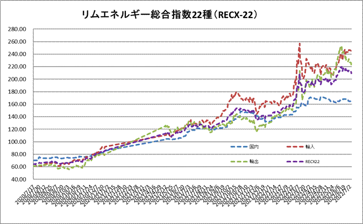 5日のリムエネルギー総合指数22種(レックス22)は209.40となり、前日比2.71ポイントと4日続落した。国内(9種)は165.19(前日比0.42上昇)、輸入(9種)は243.13(同2.22下落)、輸出(4種)は219.88(同6.32下落)。 国内指数は、総じて上昇。ガソリンは京浜渡しで同0.91ポイント、阪神渡しで同2.73ポイントそれぞれ上昇した。原油高が影響した。灯油は京浜と阪神渡しで同0.46ポイント反発した。大手元売りの仕切り価格引き下げ観測を受けた。 輸入指数は、総じて下落。LPGのプロパンとブタンは同0.66ポイント超の下げ幅となった。プロパンとブタンの相場は需給逼迫を受け上昇したものの、外国為替市場でドル安・円高に振れたため、円換算後のレックス22では弱含んだ格好。一方、ナフサは同4.45ポイント高。 輸出指数は、全面安。ジェット燃料は同14.13ポイント反落した。ベンゼンは同3.06ポイント安。いずれも取引時間内の原油高を反映した。