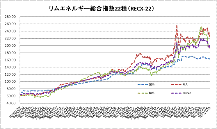 19日のリムエネルギー総合指数22種(レックス22)は191.98となり、15日比0.07ポイントと反発した。国内(9種)は161.86(15日比0.02下落)、輸入(9種)は222.25(同0.86下落)、輸出(4種)は191.84(同1.11上昇)。 国内指数は、上げ下げまちまち。灯油は京浜と阪神渡しで同0.46ポイント弱含んだ。売り気が強含んだ。A重油0.1%Sは同0.28ポイント軟化した。陸上市況の軟化を受けた。 輸入指数は、総じて下落。低硫黄重油は12.41ポイント続落した。売り圧力が台頭した。 輸出指数は、全面高。ジェット燃料と軽油は同2.19ポイント超の上げ幅となった。ベンゼンは同0.17ポイント高。いずれも原油高が影響。