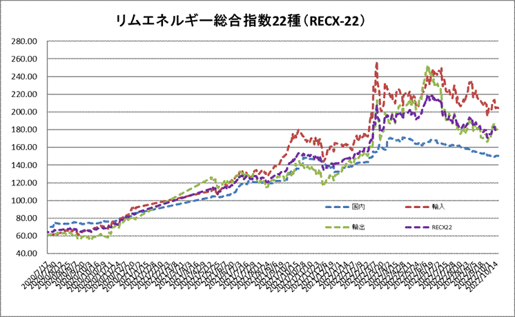 19日のリムエネルギー総合指数22種(レックス22)は178.87となり、前日比0.64ポイントと反発した。国内(9種)は150.54(前日比0.02上昇)、輸入(9種)は204.63(同0.45上昇)、輸出(4種)は181.45(同1.47上昇)。 国内指数は小動き。軽油が京浜渡しで横ばいとなった一方、阪神渡しで同0.54ポイント上昇した。旺盛な買い気を映した。それ以外の指数は前日からもち合い。 輸出入指数は、総じて上昇。輸出入のジェット燃料は同3.40ポイント超の上げ幅となった。輸入の低硫黄重油は同2.96ポイント反発した。アジア取引時間内の原油相場の堅調さを受けた。一方、輸出入のベンゼンは同0.44ポイント超の下げ幅となった。