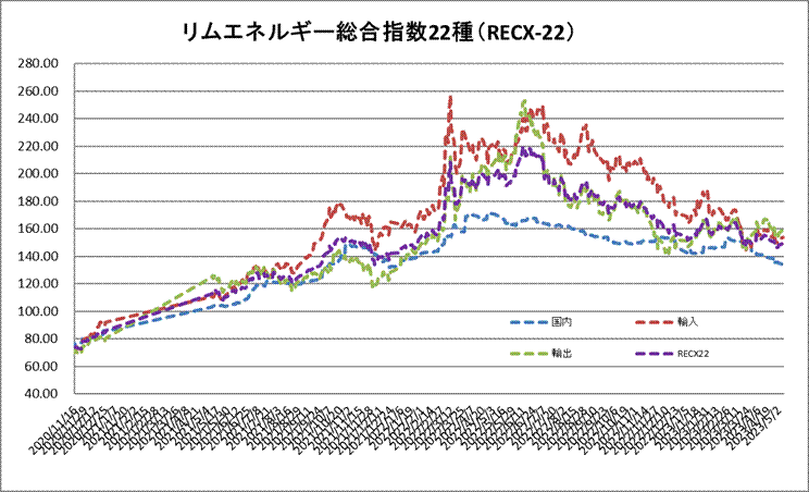 8日のリムエネルギー総合指数22種(レックス22)は149.02となり、2日から0.96ポイント上昇した。国内(9種)は134.24(2日比0.79下落)、輸入(9種)は153.71(同1.40上昇)、輸出(4種)は159.10(同2.27上昇)。 国内指数は、総じて下落。灯油が京浜と阪神渡しで同1.83ポイント超の下げ幅となった。ガソリンは京浜と阪神渡しで同0.91ポイント安。いずれも大手元売りの仕切り価格引き下げを反映した。 輸入指数は、総じて上昇。液化天然ガス(LNG)が同1.40ポイント上昇した。一方、LPGのプロパンとブタンは同0.56ポイント超の下げ幅となった。供給余剰感が相場を押し下げた。 輸出指数は、全面高。ジェット燃料と軽油がそれぞれ同2.33ポイント強含んだ。いずれも原油高が影響した。