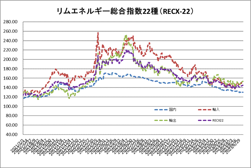 11日のリムエネルギー総合指数22種(レックス22)は145.17と、前日比0.40ポイント上昇した。国内(9種)は129.84(横ばい)、輸入(9種)は152.20(同1.00上昇)、輸出(4種)は153.45(同0.17上昇)。 国内指数は横ばい。東西ともに買い気に乏しく、様子見ムードが強かった。 輸入指数は総じて上昇。ナフサは同1.60ポイント高。アジア取引時間内の原油高を反映した。また、LNGが同4.68ポイント高と切り上がった。欧州の天然ガス相場の上昇に連動した。 輸出指数はまちまち。重油(380cst 3.5%S)が同1.92ポイント高に上昇した。原油高を映した。また、ジェット燃料が同0.73ポイント高に上昇。製油所の定修に加え、需要回復が相場を押し上げた。一方、ベンゼンは同0.79ポイント安と切り下がった。