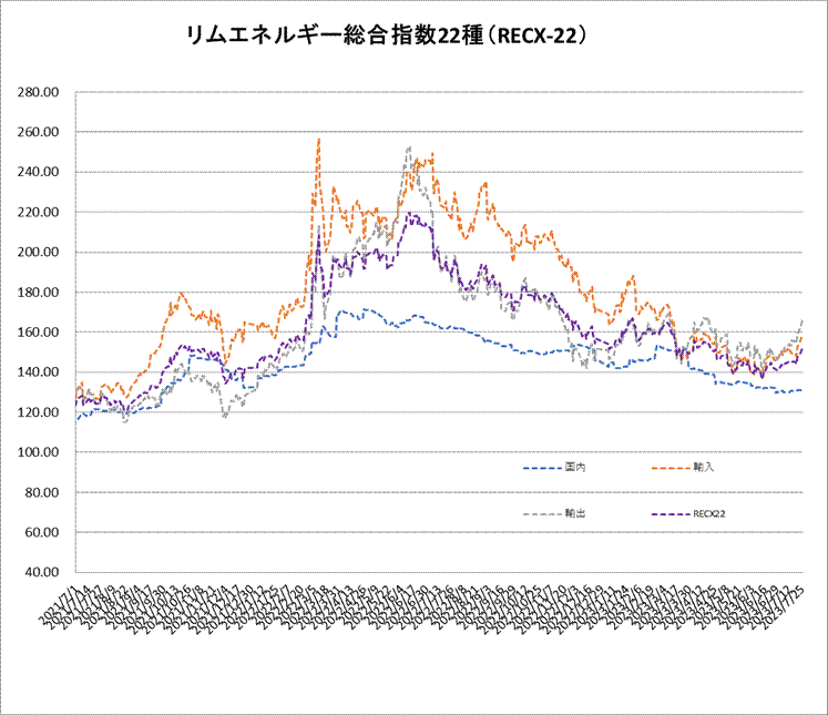 25日のリムエネルギー総合指数22種(レックス22)は151.99と、前日比2.00ポイント上昇した。国内(9種)は131.08(前日比横ばい)、輸入(9種)は159.03(同2.97上昇)、輸出(4種)は165.87(同3.04上昇)。
