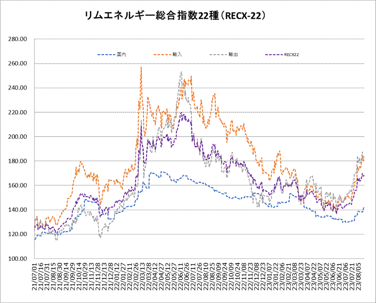 18日のリムエネルギー総合指数22種(レックス22)は168.75と、前日比0.91ポイント上昇した。国内(9種)は141.87(前日比0.03上昇)、輸入(9種)は180.63(同0.18下落)、輸出(4種)は183.74(同2.85上昇)。 国内指数は小幅上昇。京浜や西日本の0.001%S軽油が下落したものの、ガソリンが京浜渡しで前日比1.37ポイント、西日本は同1.36ポイントいずれも上伸した。先高観測を受けた。 輸入指数は切り下がった。液化天然ガス(LNG)が前日比5.92ポイント反落した。潤沢な供給に押し下げられた。 輸出指数は総じて上昇。ベンゼンやジェット燃料の上昇幅が大きく、ベンゼンは前日比4.66ポイント高、ジェット燃料は同2.03ポイント高。需要の強さや先物高を反映した。