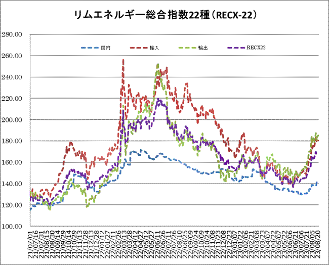 21日のリムエネルギー総合指数22種(レックス22)は169.23と、先週末比0.48ポイント上昇した。国内(9種)は141.94(先週末比0.07上昇)、輸入(9種)は180.51(同0.12下落)、輸出(4種)は185.26(同1.52上昇)。 国内指数は小幅上昇。京浜や西日本の0.001%S軽油が、先高観測により先週末から反発した。京浜渡しが0.81ポイント、西日本渡しが同1.00ポイントそれぞれ上昇した。一方、ガソリン、灯油、重油、プロパン、ブタンは前日水準を保った。 輸入指数は切り下がった。液化天然ガス(LNG)、ブタン、プロパンが弱含んだ。特にLNGは先週末比5.39ポイント続落。供給に過剰感から需給に緩みが見られた。 輸出指数は総じて上昇。特にジェット燃料は同3.22ポイント高で2日続伸。供給引き締まりから、買い気が膨らんだ。