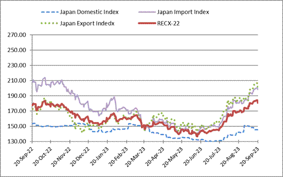 20日のリムエネルギー総合指数22種(レックス22)は180.62と、前日比3.50ポイント下落した。国内(9種)は145.28(前日比横ばい)、輸入(9種)は198.07(同2.38下落)、輸出(4種)は198.52 (同8.11下落)。