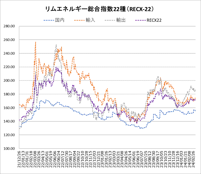 6日のリムエネルギー総合指数22種(レックス22)は前日比0.63ポイント下落し171.61となった。国内(9種)が前日比0.73ポイント下落し155.02ポイント、輸入(9種)が174.03と同0.47ポイント、輸出(4種)が185.78と同0.70ポイントそれぞれ下落した。