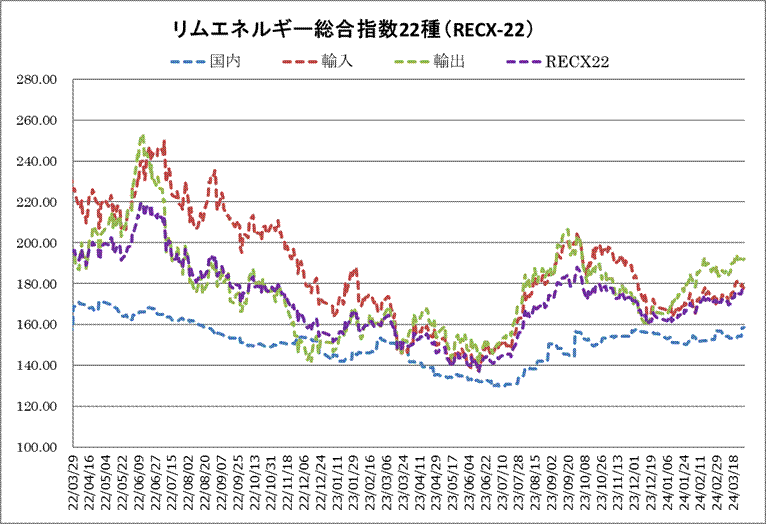 29日のリムエネルギー総合指数22種(レックス22)は前日比0.48ポイント上昇の176.33と2日ぶりに反発した。国内、輸出入指数が揃って上昇した。内訳は国内(9種)が158.54(同0.19上昇)、輸入(9種)が178.47(同0.92上昇)、輸出(4種)が191.97(同0.32上昇)だった。