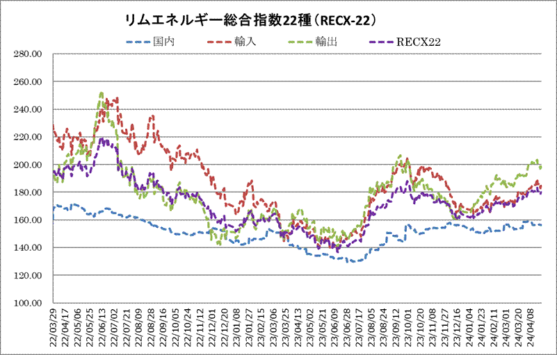 24日のリムエネルギー総合指数22種(レックス22)は、前日比1.27ポイント上昇し179.95となった。内訳は国内(9種)が156.36と前日から横ばい。輸入(9種)が同1.82ポイント上昇の184.62、輸出(4種)が同2.00ポイント高の198.88。