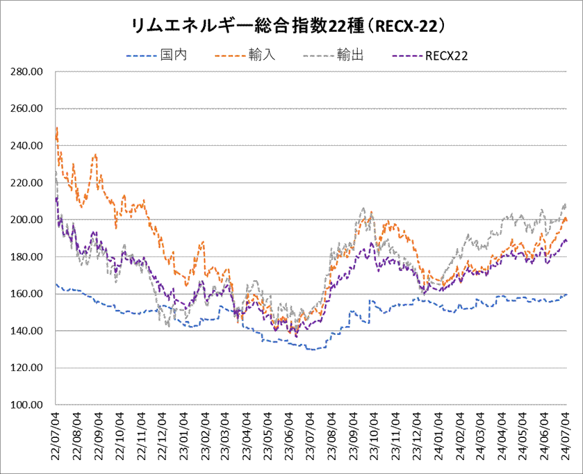 5日のリムエネルギー総合指数22種(レックス22)は188.42と、前日比0.77ポイント下落した。国内(9種)は159.43(前日比0.04下落)、輸入(9種)は199.47(同1.82下落)、輸出(4種)は206.34(同0.46下落)。