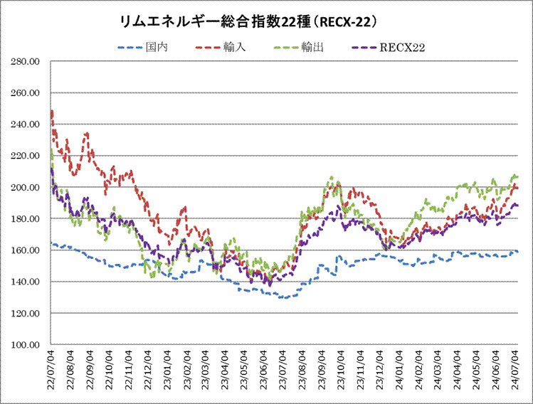 8日のリムエネルギー総合指数22種(レックス22)は188.27と、5日から0.15ポイント下落した。国内(9種)は158.90(前日比0.53下落)、輸入(9種)は199.43(同0.04下落)、輸出(4種)は206.49(同0.15上昇)。