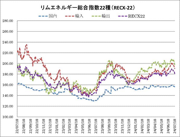 18日のリムエネルギー総合指数22種(レックス22)は181.16と、前日から0.69ポイント続落した。国内(9種)は155.52と前日比1.15ポイント下落、輸入(9種)は190.64と同0.10ポイント上昇、輸出(4種)は197.31と同1.03ポイント下落した。