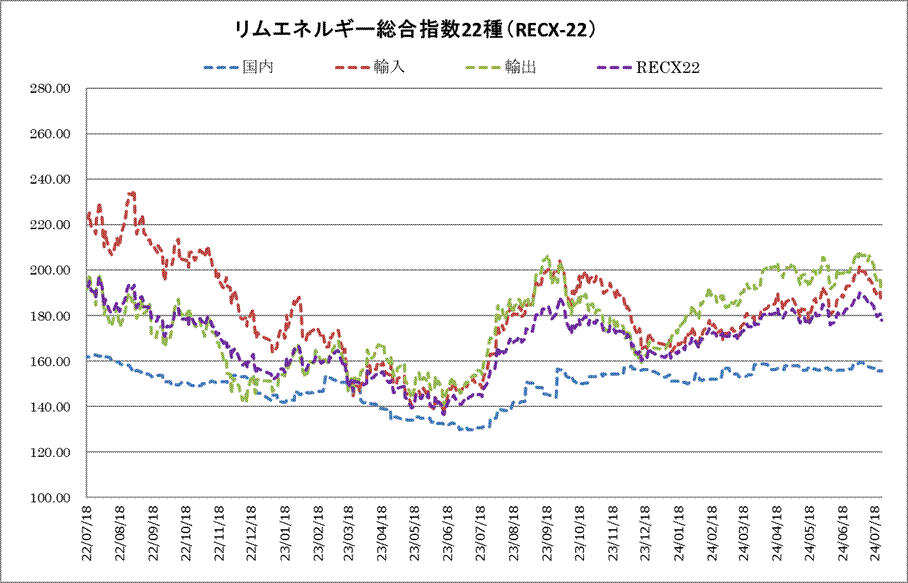 24日のリムエネルギー総合指数22種(レックス22)は177.81と、前日から0.37ポイント続落した。国内(9種)は155.74と前日から変わらず、輸入(9種)は186.31と同0.3ポイント続落、輸出(4種)も191.38と同0.82ポイント続落した。