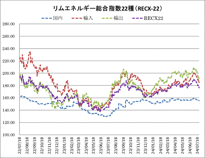 25日のリムエネルギー総合指数22種(レックス22)は176.19と、前日から1.62ポイント続落した。国内(9種)は155.43と前日から0.31ポイント下落した。輸入(9種)は184.53と同1.77ポイント、輸出(4種)は188.61と同2.77ポイントそれぞれ下落した。