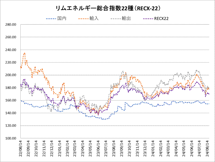 20日のリムエネルギー総合指数22種(レックス22)は169.60と前日から2.27ポイント下落した。国内(9種)は154.52と前日から0.07ポイント上昇。一方、輸入(9種)は177.26と同3.10ポイント、輸出(4種)は177.01と同3.79ポイントそれぞれ下落した。
