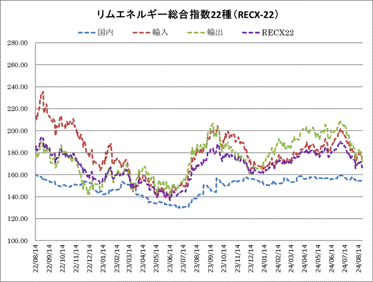 22日のリムエネルギー総合指数22種(レックス22)は166.63と前日から0.10ポイント上昇した。国内(9種)は154.53と前日から0.04ポイント上昇、輸入(9種)は172.99と同0.19ポイント下落、輸出(4種)は172.37と同0.46ポイント上昇した。
