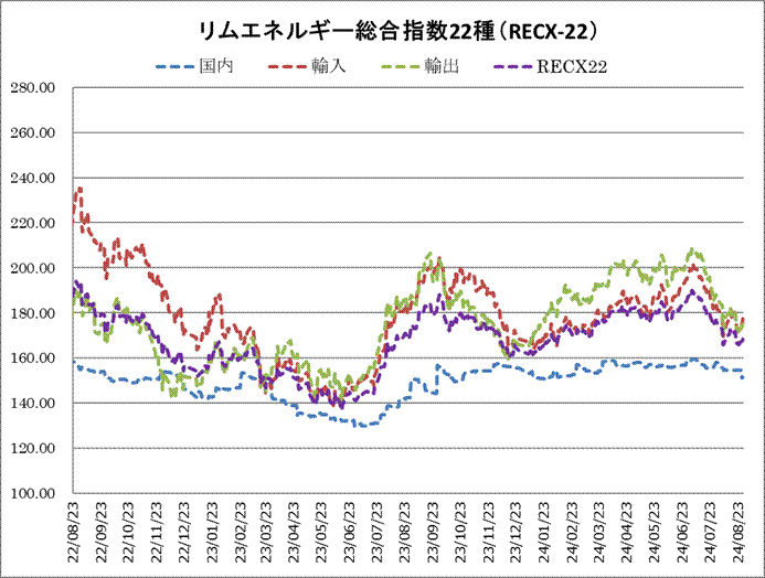 28日のリムエネルギー総合指数22種(レックス22)は168.17と前日から1.75ポイント上昇した。国内(9種)は151.38と前日から0.18ポイント、輸入(9種)は177.43と同2.99ポイント、輸出(4種)は175.71と同2.08ポイントいずれも上昇した。