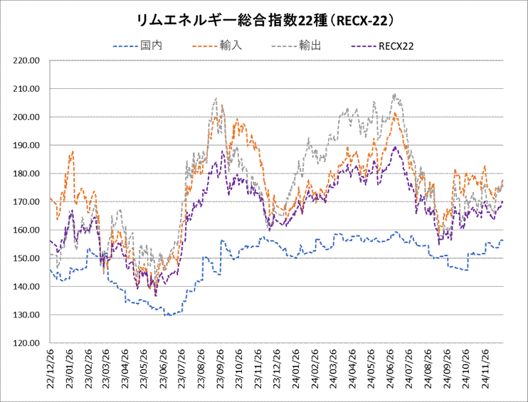 24日のリムエネルギー総合指数22種(レックス22)は169.80と前日から0.37ポイント下落した。国内(9種)は156.37と前日から0.07ポイント下落、一方輸入(9種)は177.57と同0.23ポイント上昇、輸出(4種)は175.45と同1.28ポイント切り下った。