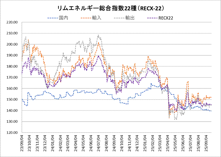 24日のリムエネルギー総合指数22種(レックス22)は145.35と、22日から0.15ポイント続落した。3日続けての下落。内訳は、国内(9種)が139.48に張り付いた一方、輸入は151.84と同0.15ポイント安、輸出が144.74と同0.18ポイント安だった。 国内指数は新規材料に乏しく、売買動意に欠けた。複数の元売りが22日を有給取得奨励日としており、市場参加者が限られていたことが背景にある。 輸入指数は液化天然ガス(LNG)が22日比4.01ポイント反落した。欧州の天然ガス市況が下落したことを受けた。ジェット燃料や軽油など一部の石油製品も弱含んだ。 輸出指数は重油が反発したものの、他の3種が22日比0.25~0.77ポイント下落した。ベンゼンはアジア取引時間における原油相場の軟化に引き摺られた。
