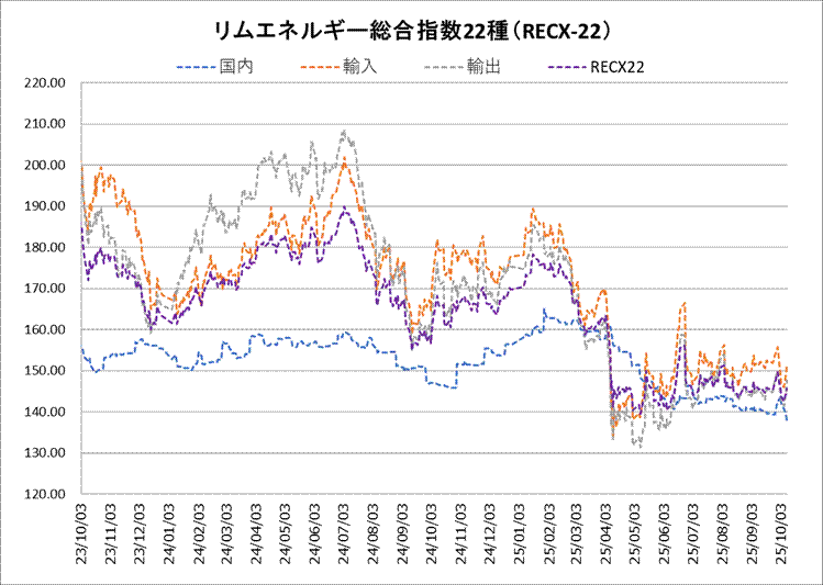 9日のリムエネルギー総合指数22種(レックス22)は145.70と、前日比1.42ポイント上昇した。国内(9種)は137.92(前日から1.14ポイント下落)、輸入(9種)は151.48(同2.46ポイント上昇)、輸出(4種)は147.41(同2.94ポイント上昇)となった。