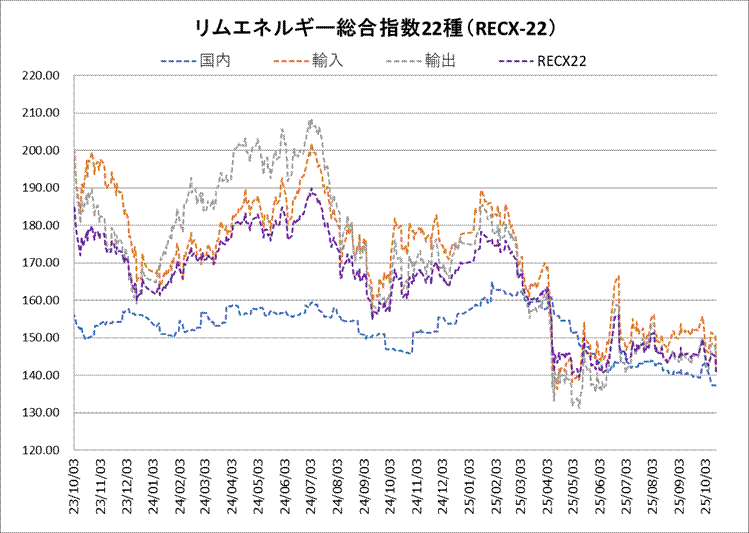 15日のリムエネルギー総合指数22種(レックス22)は140.54と、前日に比べ4.50ポイント下落した。内訳は国内(9種)が137.27で前日から横ばいだったものの、輸入(9種)が143.08と同7.49ポイント、輸出(4種)は141.25で同6.02ポイント、いずれも急落した。 国内指数は前日と同水準にとどまった。西日本の灯油が153.94、東京湾のプロパンは114.46。 輸入指数は、ブレント原油やドバイ原油の相場下落を受け、いずれも大幅に下落した。LNGは前日比で5.53ポイント軟化し246.53となった。原油安に加え欧州の天然ガス相場の下落も影響し大きく値を下げた。 輸出指数も全面安。ベンゼンは前日比4.11ポイント下落して127.00となった。