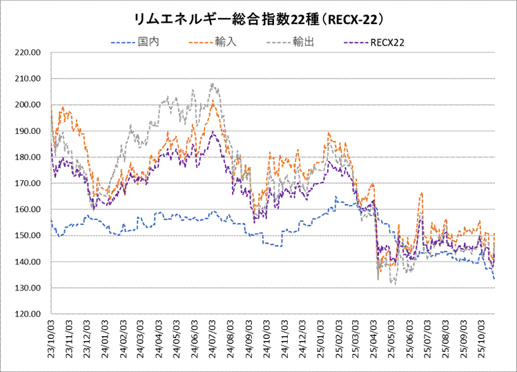 24日のリムエネルギー総合指数22種(レックス22)は143.63と、前日に比べ3.69ポイント切り上がった。内訳は国内(9種)が133.69で前日比0.07ポイント、輸入(9種)が150.82と同5.65ポイント、輸出(4種)は146.45で同5.35ポイント、いずれも上昇した。 国内指数は灯油を除き横ばい。様子見ムードが強く、全般的に動意薄だった。一方、灯油は東西ともに0.92ポイント上昇した。北日本の気温低下が影響し、引き合いが強まった。 輸出入指数は原油価格の上昇を受けて全面高。特にジェットケロシンは、いずれも8ポイント以上の上げ幅となった。