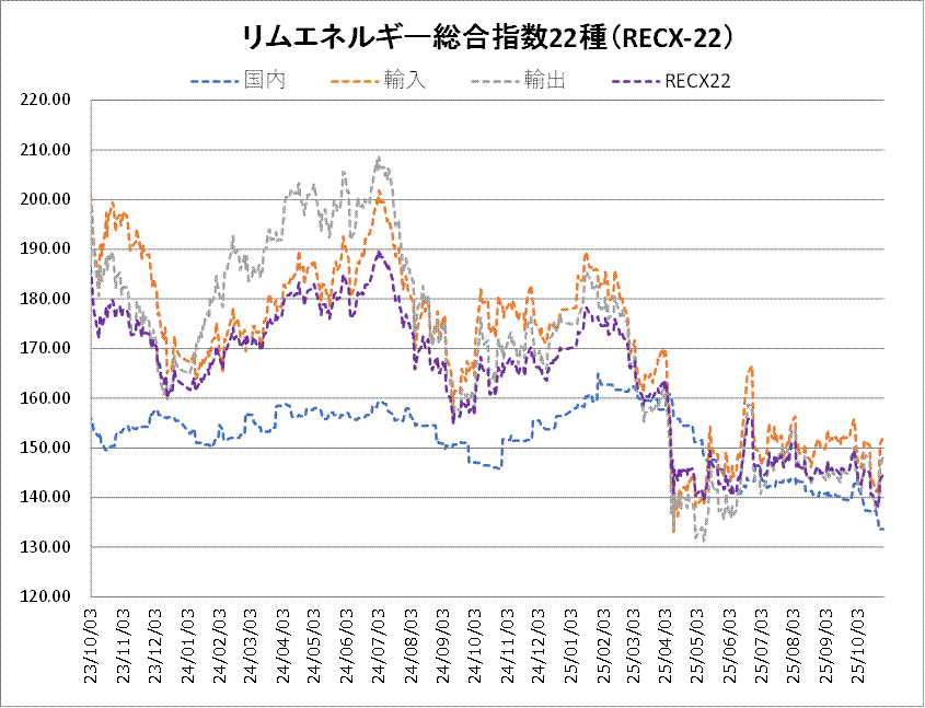 27日のリムエネルギー総合指数22種(レックス22)は144.73と、先週末に比べ1.10ポイント切り上がった。内訳は国内(9種)が133.69で先週末比横ばいだった一方、輸入(9種)は152.34と同1.52ポイント、輸出(4種)は148.22で同1.77ポイント、いずれも上昇した。 国内指数は先週末から総じて横ばい。24日は10月渡しの商談最終日だったため、新規の取引のない閑散とした市場だった。 輸入指数は軽油が先週末比4.43ポイント高など、石油製品が上げを牽引。原油高に加え買い気の高まりが相場を押し上げた。ただプロパンやブタンなどは需要が一服に伴い下落した。 輸出指数は石油製品が先週末から上昇。原油市況の上昇に連動した。