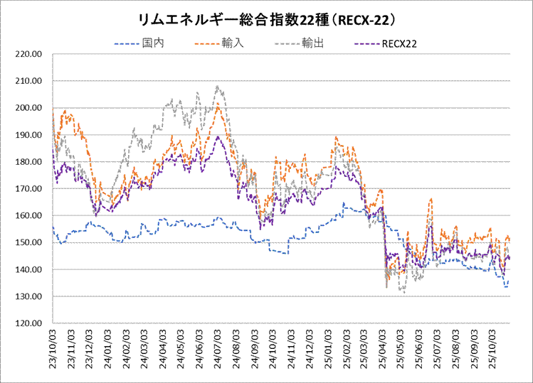 31日のリムエネルギー総合指数22種(レックス22)は144.55と、前日比0.99ポイントの上昇。内訳は国内(9種)が136.46で前日から変わらなかった一方、輸入(9種)が152.15と同1.45ポイント、輸出(4種)が145.03で同1.50ポイントそれぞれ上昇した。 国内指数はガソリンの西日本が販売価格の見直しを受け上昇したが、軽油が東西ともに売り圧力が高まり軟化し西日本のガソリンの上げを相殺した。輸入、輸出ともにジェット/ケロシンが季節的な需要の高まりを背景に上昇し、指数を押し上げた。