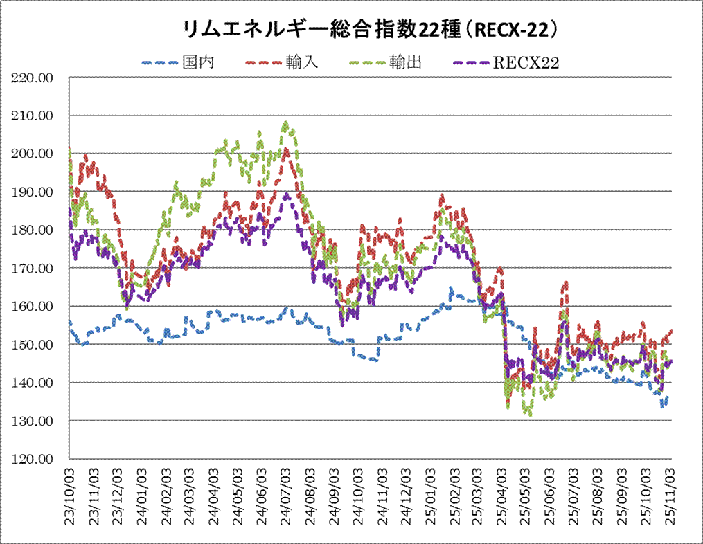 4日のリムエネルギー総合指数22種(レックス22)は145.67と、31日から1.12ポイント上昇した。内訳は国内(9種)が136.46で前日から横ばいだったが、輸入(9種)が153.53と同1.38ポイント、輸出(4種)が147.03で同2.0ポイント、それぞれ上昇した。 国内指数は、実質的な11月入りを前に軒並み前日水準を維持した。輸入、輸出指数は、原油価格の上昇を受けて石油製品が上昇、全体の上げ要因になった。