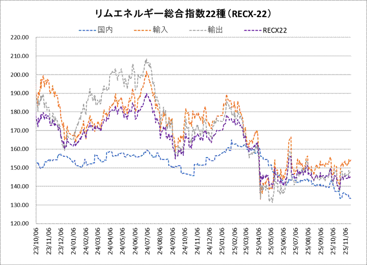 18日のリムエネルギー総合指数22種(レックス22)は145.22と、前日から0.22ポイント上昇した。内訳は国内(9種)が133.44と同0.27ポイント安、輸入(9種)が154.15と同0.37ポイント高、輸出(4種)が148.35と同0.58ポイント高。 国内指数は、全般的に動きがなかったが、軽油が東西で上昇した。買い気の高まりを映した。輸入市況に比べて国内市況は割安感が強いという。一方、LPGは阪神のプロパンおよびブタンともに下落。売り気の強さが相場を圧迫した。 輸入指数は、上げ下げまちまち。LNGは反発し、欧州の天然ガス相場の上昇につれ高となった。一方、ナフサは反落した。需要の低調さが相場の弱材料となった。 輸出指数は総じて上昇。ベンゼンが上昇し、14日の米国時間の取引でベンゼン相場が上昇したことを映した。