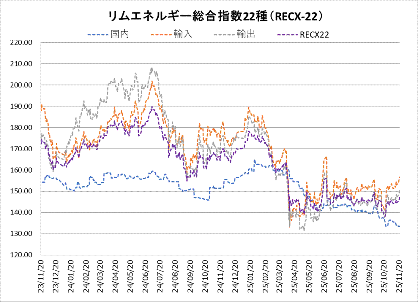 20日のリムエネルギー総合指数22種(レックス22)は147.10と、前日から1.14ポイント上昇した。内訳は国内(9種)が133.50と同0.06ポイント上昇、輸入(9種)が156.64と同0.95ポイント上昇、輸出(4種)が151.15と同2.39ポイント上昇。 国内指数は灯油が上昇。気温低下に伴う実需の発生、一部製油所の装置不調などを反映した。もっとも灯油以外の石油、液化石油ガス(LPG)は基本的にもち合っており、国内全体で均した指数の伸びは小幅にとどまる。 輸入指数、輸出指数はいずれもジェット燃料、軽油が急ピッチで上昇した。シンガポール市況の上昇を映した。