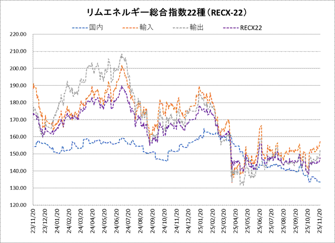21日のリムエネルギー総合指数22種(レックス22)は147.59と、前日から0.49ポイント上昇した。内訳は国内(9種)が133.48と同0.02ポイント下落する一方、輸入(9種)が157.15と同0.51ポイント上昇、輸出(4種)が152.14と同0.99ポイント上昇。 国内指数はプロパンの下落が全体を押し下げた。 輸入指数はベンゼンの反発がけん引し、ナフサ、プロパンおよびブタンの上昇によって全体が切り上がった。 輸出指数も同様にベンゼンを中心に上昇。一方、ジェット燃料油および軽油は下落した。