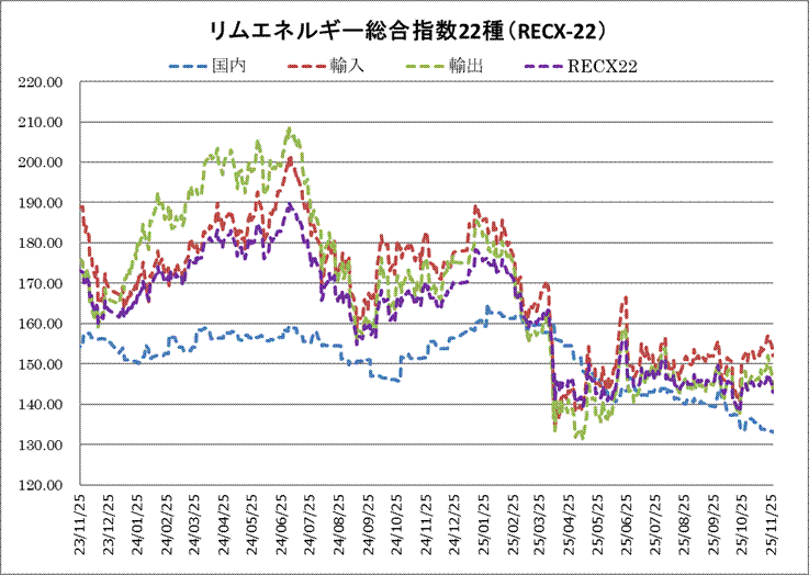26日のリムエネルギー総合指数22種(レックス22)は142.94と、前日から1.89ポイント続落した。内訳は国内(9種)が133.16と同0.18ポイント下落、輸入(9種)が152.13と同2.09ポイント下落、輸出(4種)が143.55と同3.37ポイント下落した。 国内指数はプロパンとブタンが続落。売り圧力の強さを受けた。石油製品は11月渡し最終日となり、新規取引は浮上しにくかった。 輸出入指数は軟調。なかでもLNGは前日から9.71ポイント下落した。実需が乏しいうえ、米国からの供給増加観測が相場に下落圧力を加えた。石油製品も先物安を受け、弱含みの展開となった。一方で、プロパンやブタンは買い気の高まりを受け、上昇した。 輸出指数は全面安。なかでも軽油やジェットケロシンといった中間品は3営業日連続で下落。ジェットケロシンは前日比4.48ポイント、軽油は4.97ポイントそれぞれ下落した。