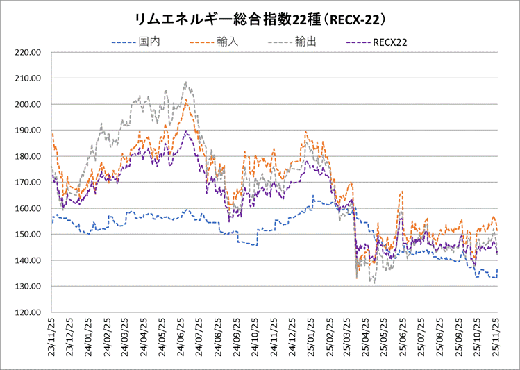 27日のリムエネルギー総合指数22種(レックス22)は143.40と、前日から0.46ポイント反発した。内訳は国内(9種)が136.48と前日比3.33ポイント上昇する一方、輸入(9種)は151.45と同0.69ポイント、輸出(4種)は142.27と同1.27ポイント、いずれも下落した。 国内指数は上昇。プロパンとブタンの上昇が指数を押し上げた。 輸入指数は下落した。軽油は前日比マイナス3.31ポイントと、下げ幅が大きかった。精製マージンの高さを好感した中国の精製業者らが、軽油の生産を増やすとの観測が広がった。 輸出指数も下落。ジェットケロシンが前日比で3.91ポイント、軽油は3.61ポイントそれぞれ下落した。
