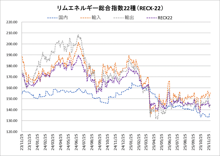 1日のリムエネルギー総合指数22種(レックス22)は145.13と、28日から1.26ポイント続伸した。内訳は国内(9種)が135.84と前日比0.39ポイント続落した一方、輸入(9種)は155.31と同2.22ポイント、輸出(4種)は144.22と同1.27ポイント、いずれも続伸した。 国内指数は、ガソリンと軽油がそれぞれ下落。陸上市況の下落を映し、唱えを切り下げる動きが進んだ。 輸出入指数は、輸入LNGを除き全面高。原油上昇を映し、石油製品やLPG、石油化学品のいずれも底上げの動きが進んだ。一方、輸入LNGは欧州の天然ガス相場が軟化したことに連動安となった。