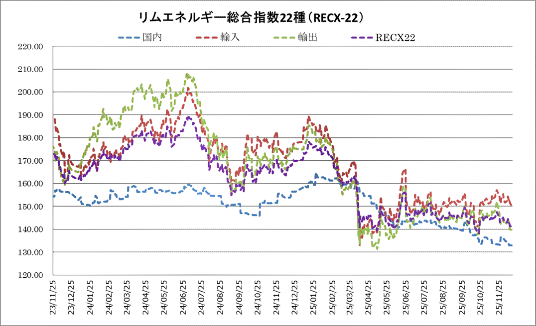 16日のリムエネルギー総合指数22種(レックス22)は140.71と、前日から0.30ポイント続落した。内訳は国内(9種)が0.06ポイント減の132.92、輸入(9種)は同0.69ポイント減の149.68、輸出(4種)も同0.14ポイント減の139.53と、いずれも下落した。 国内指数は、灯油が軟調。気温の上昇予想を受け、先高期待が後退した。輸入指数もジェット燃料や軽油が下振れ。原油安や円高を映した。 輸出指数も弱含み。輸入指数同様にジェット燃料や軽油が精彩を欠いた。