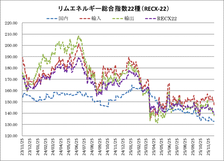 17日のリムエネルギー総合指数22種(レックス22)は138.96と、前日から1.75ポイント続落した。内訳は国内(9種)が0.15ポイント減の132.77、輸入(9種)は同3.42ポイント減の146.27、輸出(4種)も同1.68ポイント減の137.85と、いずれも下落した。 国内指数は、灯油が軟調。仕切り価格の実質引き下げ予想が広がり、自社玉消化に走る売り手が増えたことが重石となった。輸入指数は全製品で下がった。原油安や買い気の減退を映した。 輸出指数も弱含み。ジェット燃料など全製品で下振れ。先物価格の下げを反映した。