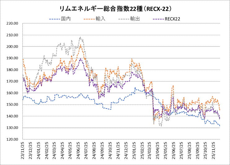 19日のリムエネルギー総合指数22種(レックス22)は139.85と、前日から0.85ポイント上昇した。国内(9種)が0.33ポイント減の131.51と下落した一方、輸入(9種)が同0.82ポイント増の146.17、輸出(4種)が同2.06ポイント増の139.18とともに上昇した。 国内指数は、プロパン、ブタンの京浜が下落した。売り手が依然として12月渡しの玉を抱えており強い売り気が見られた。輸入はナフサやジェット、LNGが上昇、プロパン、ブタンが下げた。LNGは暖房需要への期待を背景に欧州相場が上昇したことに連動した。輸出指数は全油種が上昇した。原料コスト指標である原油相場に持ち直しの動きがみられたことを受けた。