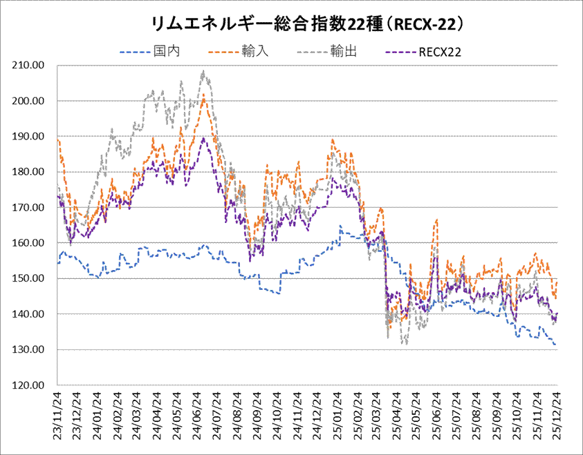 24日のリムエネルギー総合指数22種(レックス22)は、前日から0.22ポイント上昇し140.18となった。国内(9種)は131.51と横ばい、輸入(9種)は同0.93ポイント高の149.37、また、輸出(4種)は同0.25ポイント安の139.68となった。
