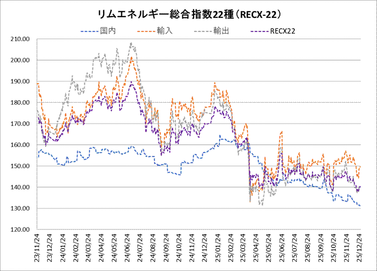 26日のリムエネルギー総合指数22種(レックス22)は140.19と、前日から0.21ポイント反落した。国内(9種)は130.90と同0.17ポイント安、輸入(9種)が149.55と同0.20ポイント安、輸出(4種)が140.12と同0.26ポイント安と総じて軟化した。 国内指数は東京湾および西日本のガソリン市況安を反映した。国内のガソリン在庫の増加から需給緩和感が意識された。 輸入指数は石油製品、液化天然ガス(LPG)ともに0.20~0.30ポイント下落した。輸出指数もおおむね0.30ポイントほど低下。円高・ドル安が影響した。クリスマス休暇により商いは閑散とした。