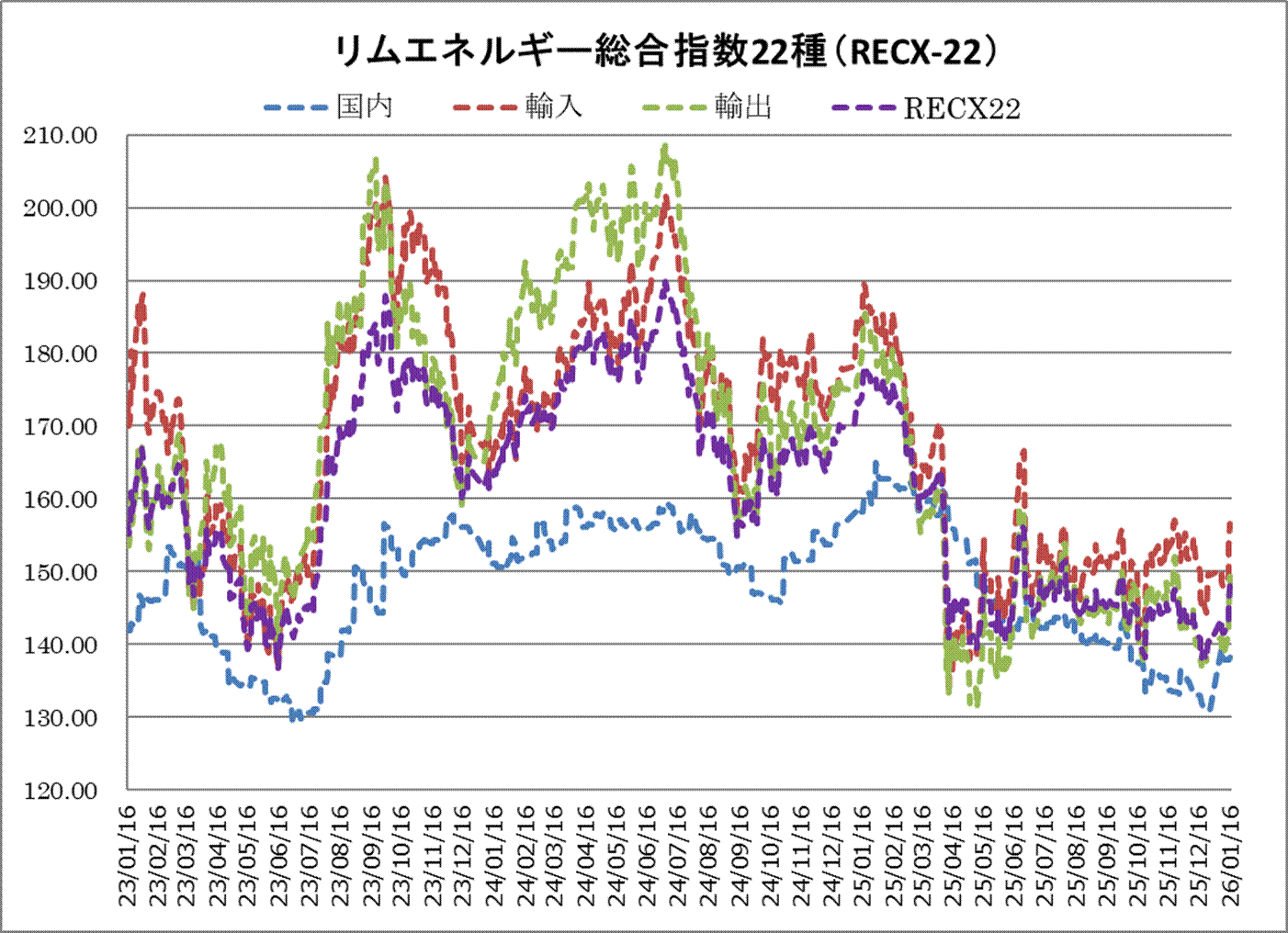 16日のリムエネルギー総合指数22種(レックス22)は146.86と前日比で1.15ポイント反落した。内訳は国内(9種)が同0.03ポイント下落の138.11、輸入(9種)が同1.47ポイント下落の155.06、輸出(4種)が同1.94ポイント下落の147.4だった。 国内、輸入、輸出ともに原油相場の軟化を映した。国内は為替がドル安・円高方向に振れたことも下落要因となっており、とくにガソリンが弱含んだ。輸出入は石油製品、石油化学製品が全般的に下げている。