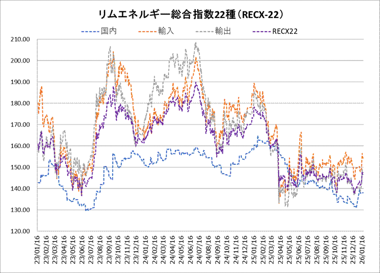 19日のリムエネルギー総合指数22種(レックス22)は146.52と前日比で0.34ポイント続落した。内訳は国内(9種)が先週末比横ばいの138.11、輸入(9種)が同1.17ポイント下落の153.90。一方、輸出(4種)は同0.14ポイント上昇の147.54だった。 国内は1月渡しの取引がおおむね一巡。輸入、輸入はプロタンおよびブタンの下落が価格全体を押し下げた。ナフサ、軽油および重油の下落も寄与した。 一方、輸出は主に石化製品の上昇が全体の上昇につながった。ベンゼンが上昇したほか、ジェット燃料油が切り上がった。