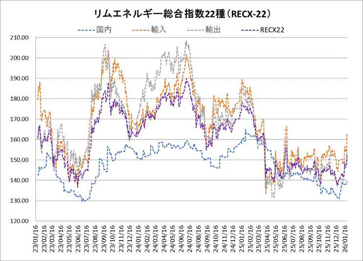 23日のリムエネルギー総合指数22種(レックス22)は152.58と、前日比2.86ポイント上昇した。国内(9種)は139.12(前日から横ばい)、輸入(9種)は162.83(同4.70ポイント上昇)、輸出(4種)は155.81(同3.88ポイント上昇)となった。