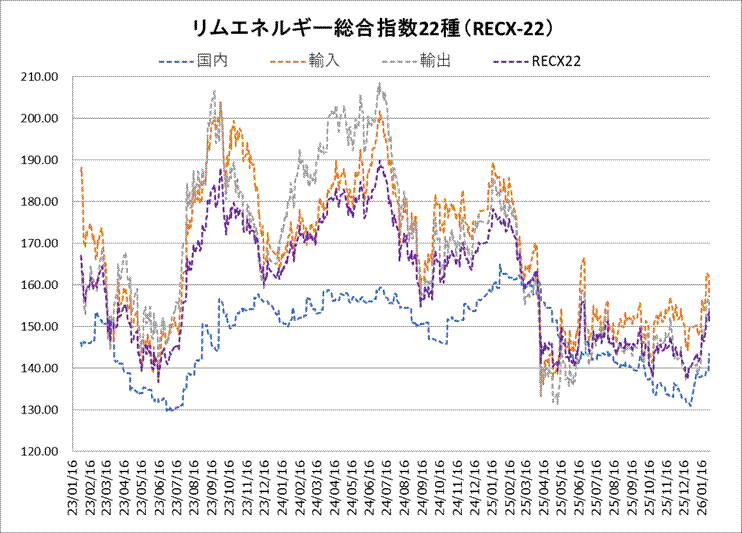 28日のリムエネルギー総合指数22種(レックス22)は150.67と、前日比2.75ポイント下落した。国内(9種)が143.42と前日から0.02ポイントの低下にとどまったものの、輸入(9種)が157.32と同3.92ポイント、輸出(4種)が151.26と同4.32ポイント、いずれも大幅に軟化した。