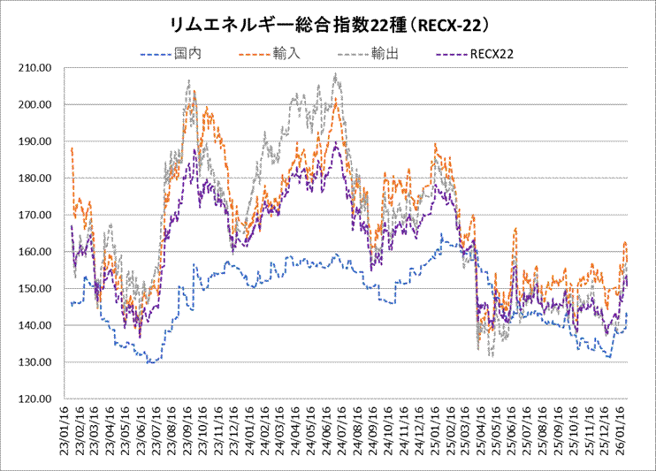 29日のリムエネルギー総合指数22種(レックス22)は151.22と、前日比0.55ポイント続伸した。その内訳は、国内(9種)が前日比0.76ポイント下落の142.66、輸入(9種)が同0.63ポイント上昇の157.95、輸出(4種)は同1.77ポイント上昇の153.03だった。